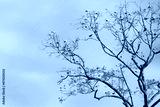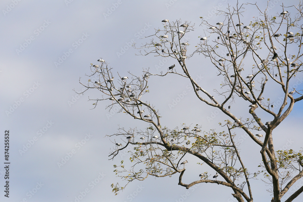Many Asian Openbill were sitting on the branches of a large tree that didn't have many leaves.