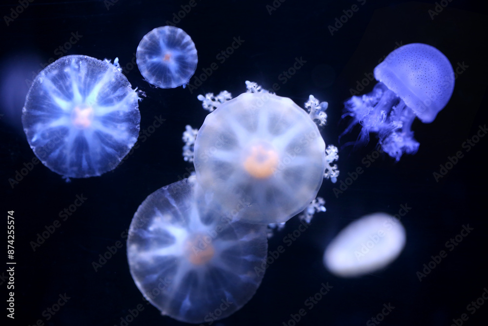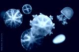 Upside down jellyfish on black background.