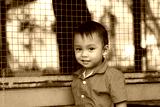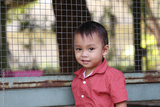 An Asian boy in a red shirt is smiling happily.