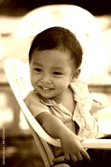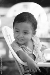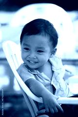 An Asian boy in a blue shirt sits on a white chair.