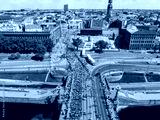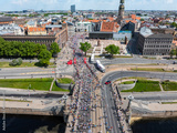 A vibrant aerial shot capturing the energy of marathon runners crossing a bridge in Riga, Latvia, with the city's skyline in the background.