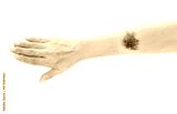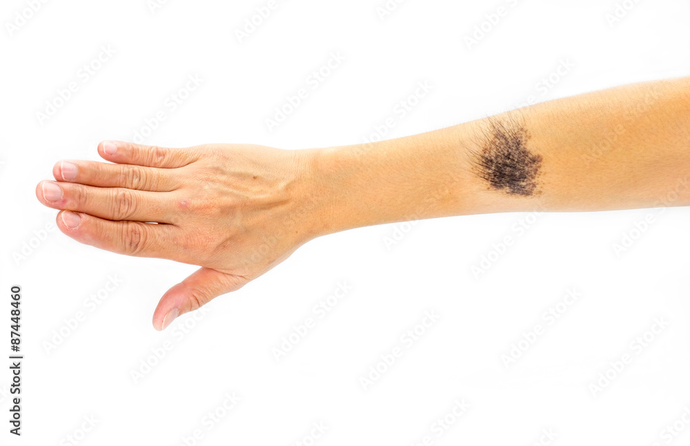 Black birthmark on arm on white background