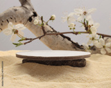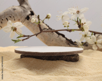 Flower, dry wooden birch branch snag log podium platform on beige sand background. Minimal empty display product presentation scene.