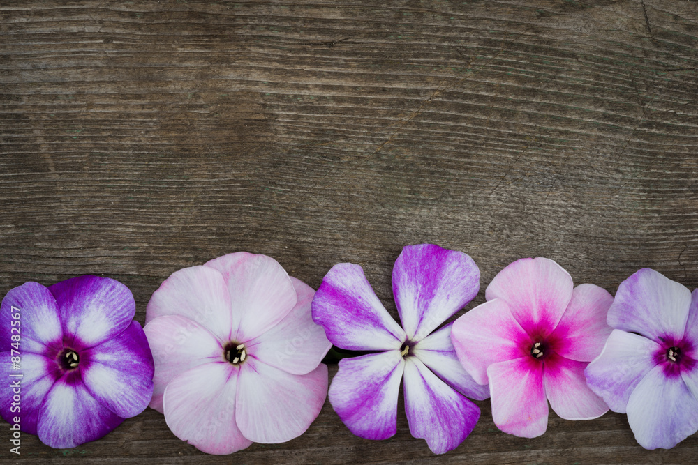 row pf flowers phloxes on a wooden background, closeup top view with copy space for your congratulations text
