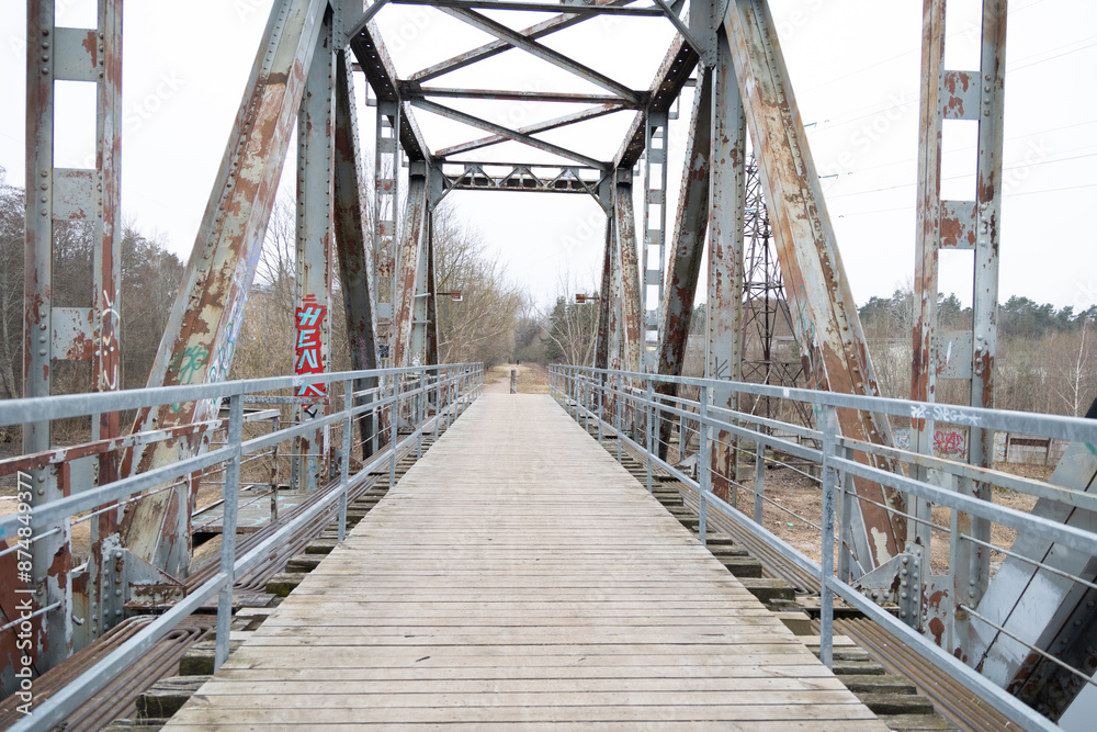 A metal truss bridge over the river in overcast spring day. Natural springtime scenery in Riga, Latvia.