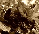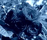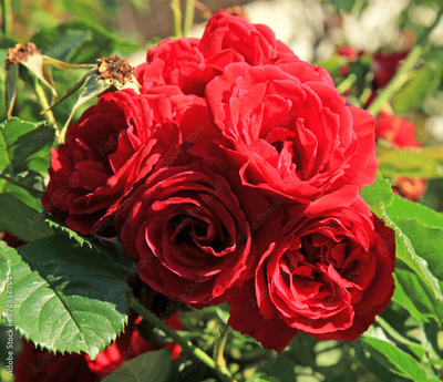 Beautiful red roses. Buds with many scarlet or ruby rose flowers, in deep red color. Nice roses as a symbol of love, beauty and romance. Luxurious, blooming flower with the sweet, fragrant odor