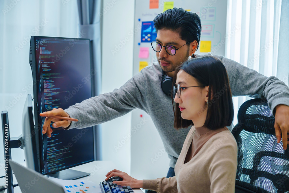 asian and Indian Developer team discussion feedback analysis coding data with software computer at office
