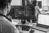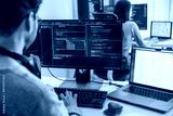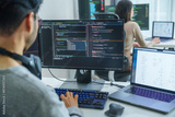Asian software developers working on multiple screens displaying code and application diagrams in a modern office