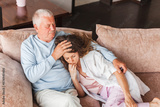 Worried aged father embracing comforting sad grown up daughter with broken heart family sit on sofa