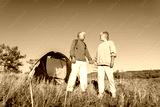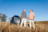 Camping tent vacation Srnior couple man and woman enjoying freedom at forest