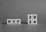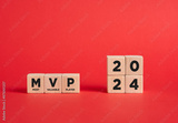 The abbreviation MVP most valuable player of the year 2024 on wooden cubes with red background.