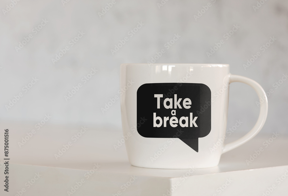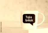 The message take a break on a speech bubble printed on a coffee mug over the table.