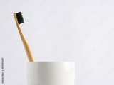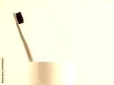 Close up of a Bamboo toothbrush in a white mug against white background.