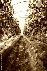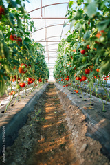 Rows of red tomatoes ripening on the vine in the greenhouse