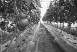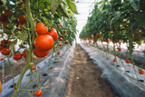 Rows of red tomatoes ripening on the vine