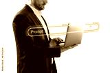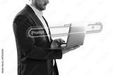 A professional man using a laptop with glowing neon prompt lines, isolated on a white background, conceptualizing technology and innovation