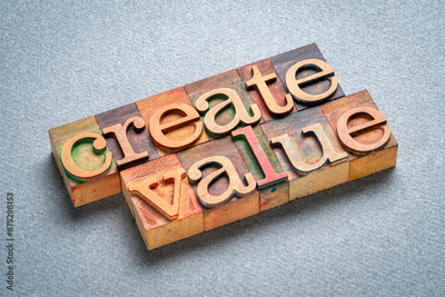 create value typography - words in vintage letterpress wood type blocks, inspiration, creativity and business concept