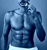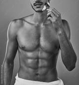 Grooming, man and shaving face in studio in topless, abs and epilation on gray background. Male person, skincare and razor for hair removal with healthy body, six pack and routine or transformation