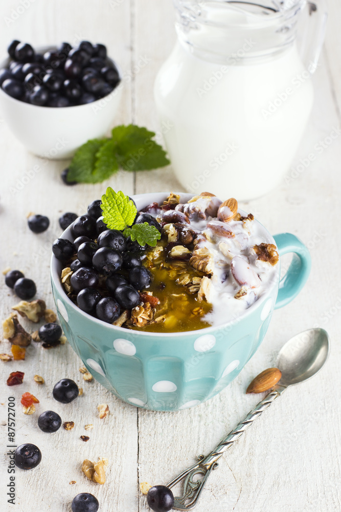 granola with blueberry, mint, honey and milk in blue bowl on a w