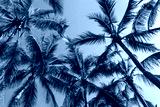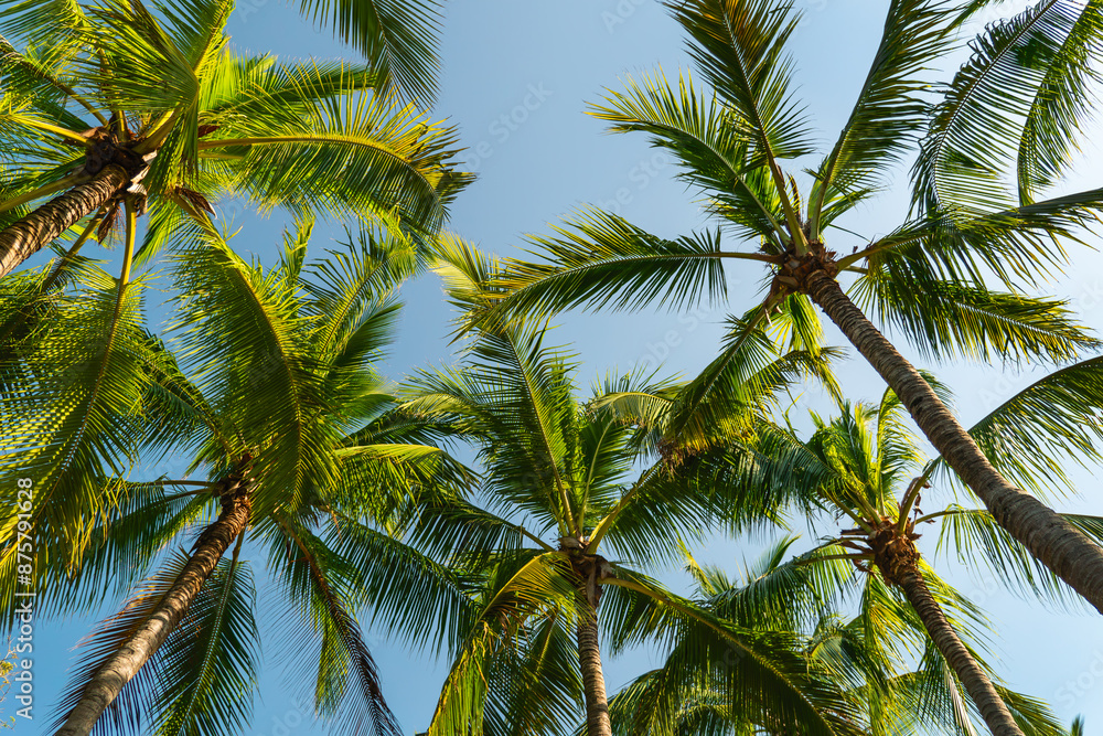 Green palm tree against blue sky and white clouds. Bottom view of palm trees tropical forest at blue sky background, tropical nature pattern. Relax natural view