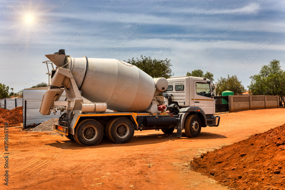 concrete mixer trucks on a dirt road on construction site