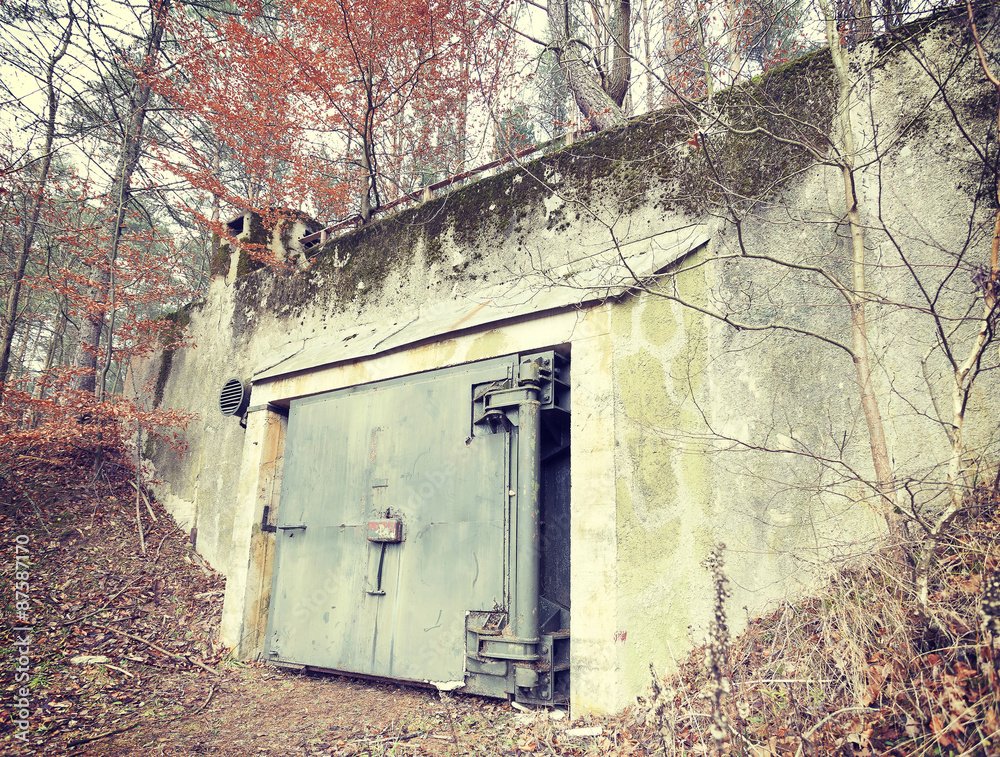 Retro filtered picture of a cold war Soviet Union nuclear military bunker in forest, Podborsko, Poland.