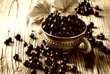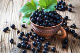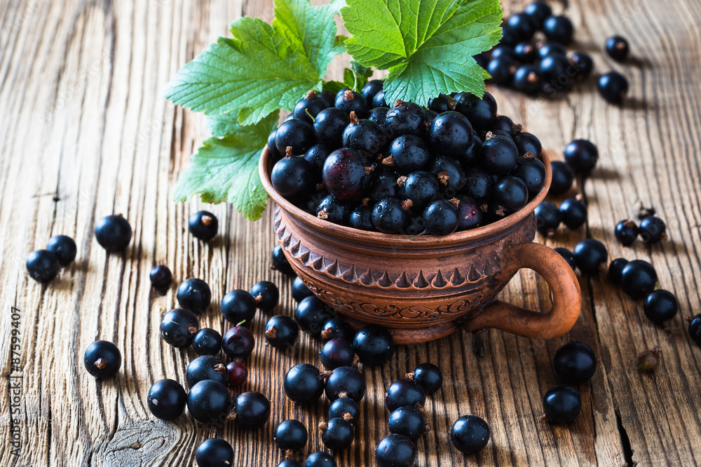 Blackcurrant in ceramic mug on rustic wooden board