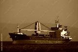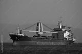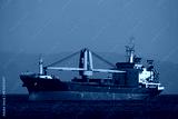 A vessel is anchored in a sea bay with a yellow industrial crane on board.