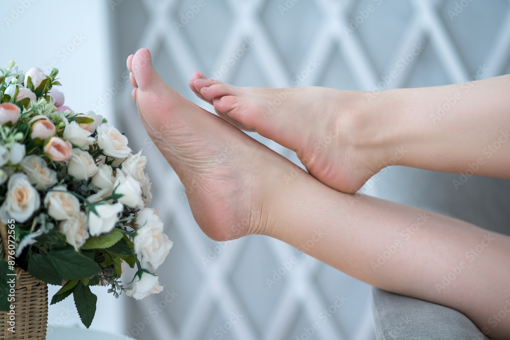 Beautiful female foot closeup, corns and calluses on feet, dry skin on legs, cracked heels, barefoot woman relaxing on sofa