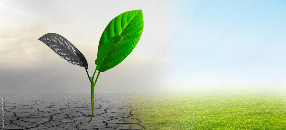 Junge Pflanze wächst aus der Erde zwischen Dürrem Boden und grünem Gras
