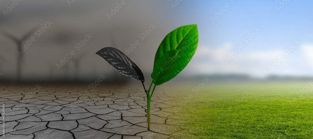 Junge Pflanze wächst aus der Erde zwischen Dürrem Boden und grünem Gras