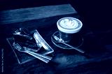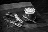 Coffee and cake on wood table in coffee cafe