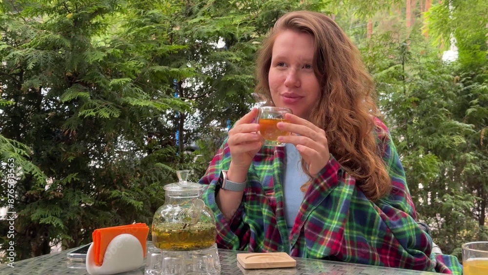 Young happy woman drinking herbal tea outdoors in cafe on terrace in cozy plaid