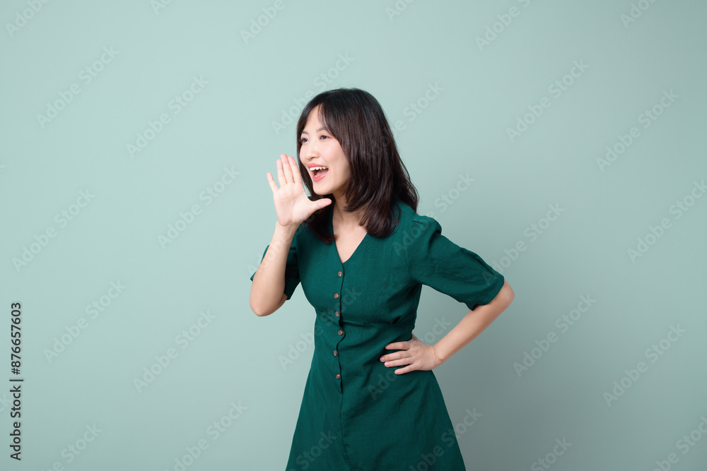 Happy Asian woman shouting above green dress poses against green background blank copy space for advertising content promotion