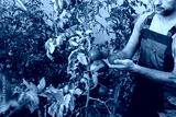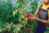 Farmer taking care of organic tomatoes in a small greenhouse.