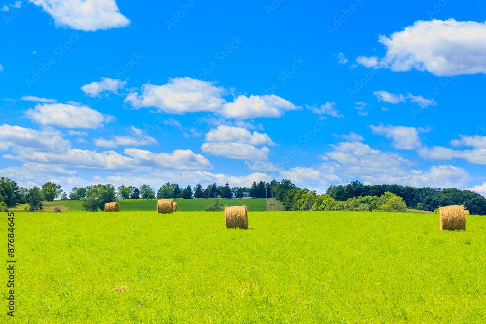 Round hay bales on the green field