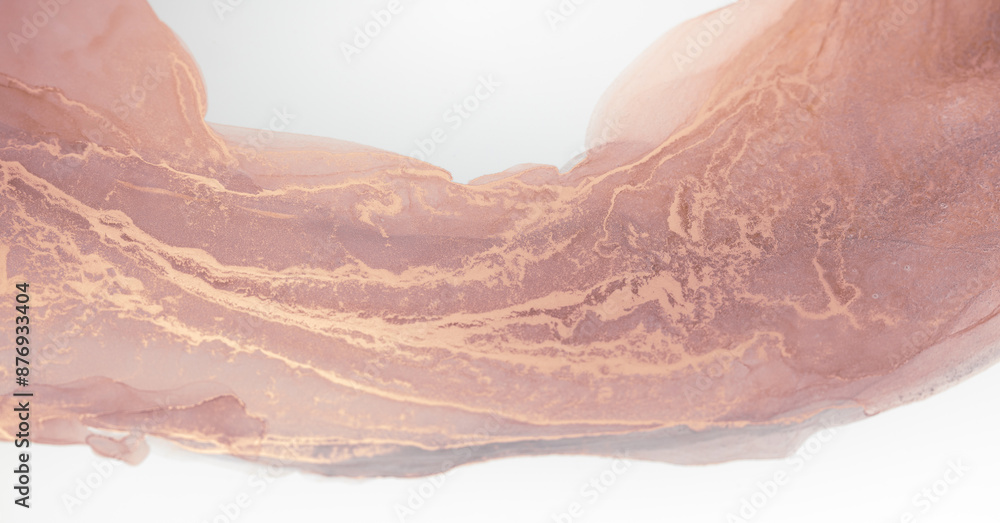 A close-up shot of an abstract, fluid art piece with rose gold swirls on a white background