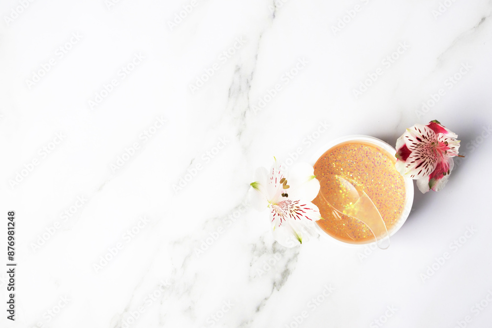 Eye patches with flower on marble background, clean beauty package for facial care, korean skin care trend.