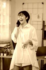 A woman is talking on her cell phone while standing in a room. She is wearing a white shirt and shorts
