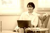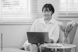 A woman is sitting on a couch with a laptop in front of her. She is smiling and she is enjoying her time. The room has white blinds and a vase of flowers on a table