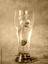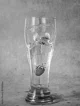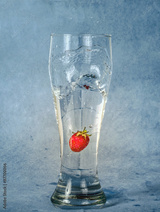 ripe strawberries falls in a glass of water