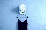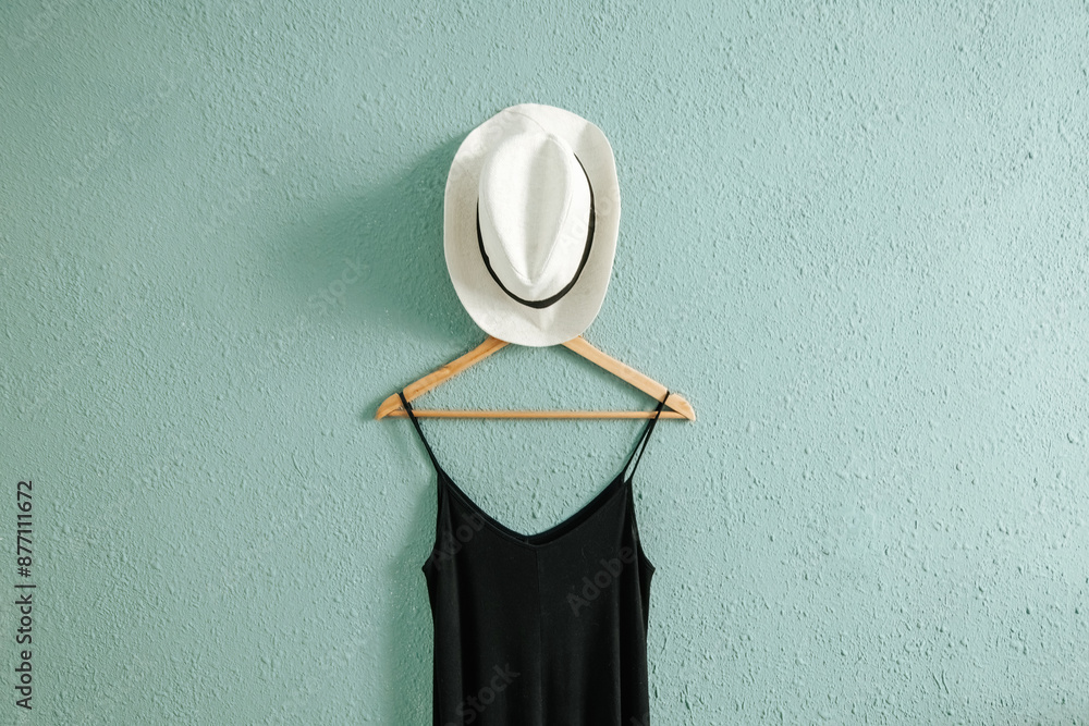 Black dress and a summer hat on a hanger with rough old wall background