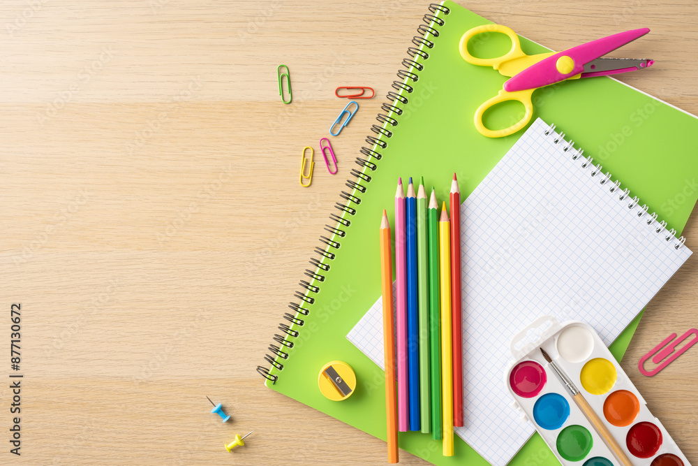 Top view of colorful school supplies including notebooks, pencils, scissors, and watercolors on a wooden desk