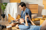 happiness asian lover couple lying on your lap postive conversation taking a break between home relocation home moving in to new house happiness casual house renovation, asian couple lying on floor