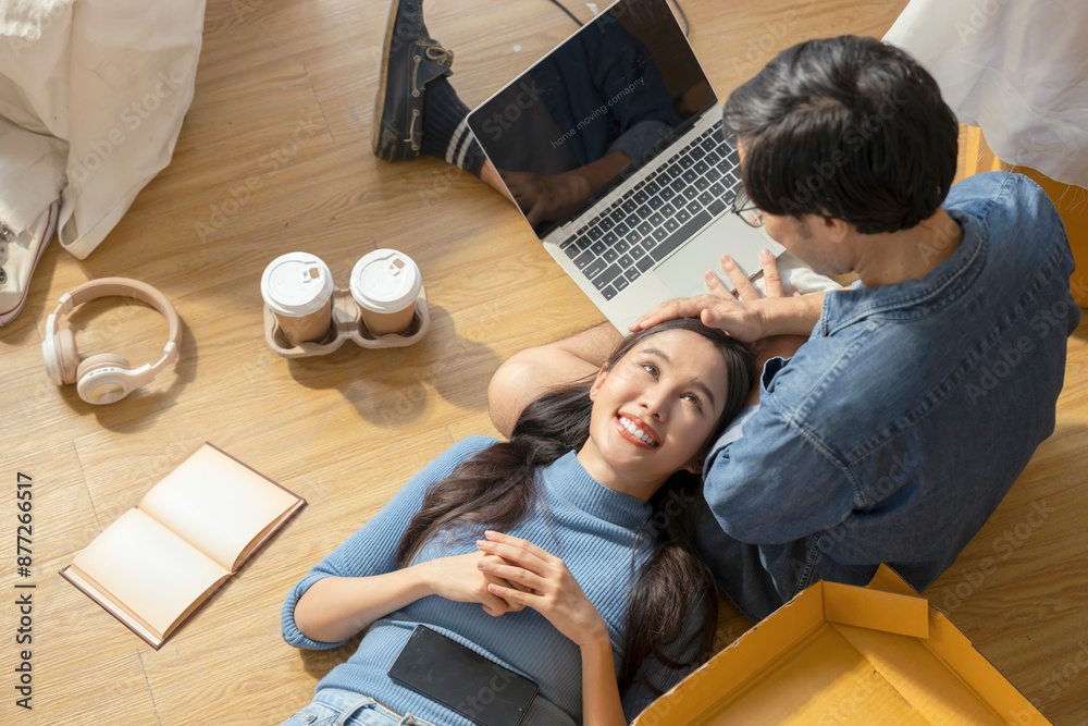 happiness asian lover couple lying on your lap postive conversation taking a break between home relocation home moving in to new house happiness casual house renovation, asian couple lying on floor