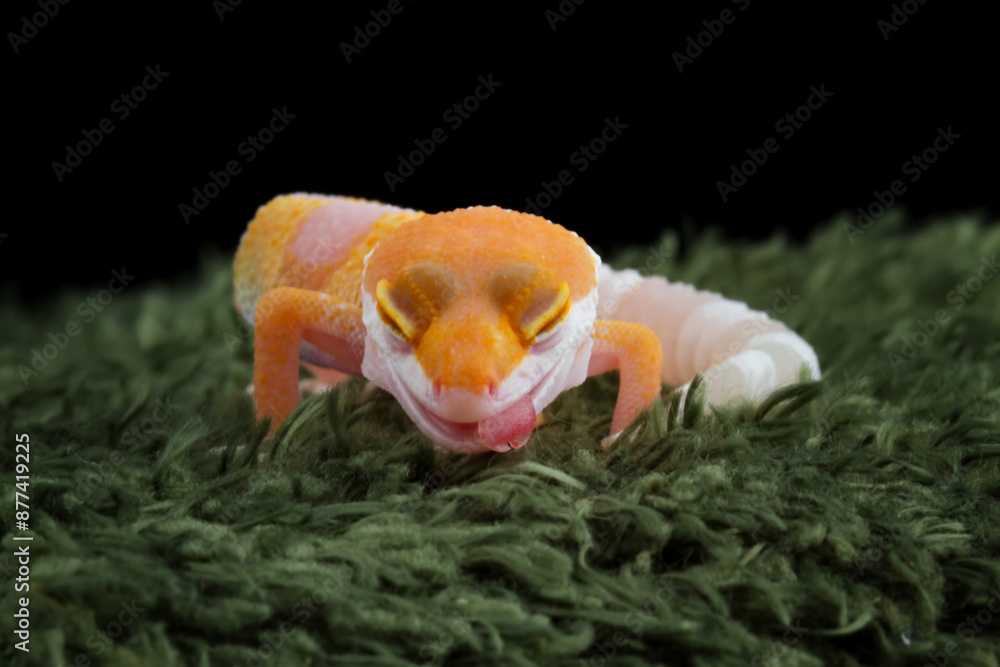 Baby leopard gecko lizard on a wool , eublepharis macularius
