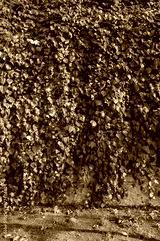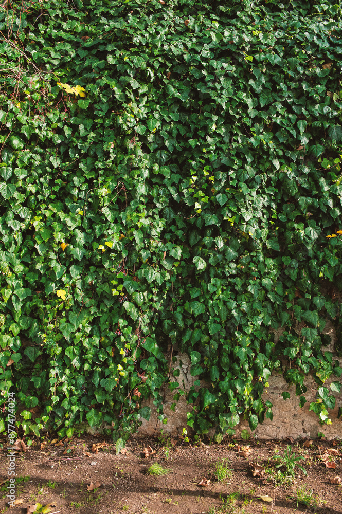 Brick wall covered with dense green ivy creates a picturesque and natural backdrop