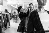 Multiracial woman shop assistant walking inside store and correcting clothes on mannequins