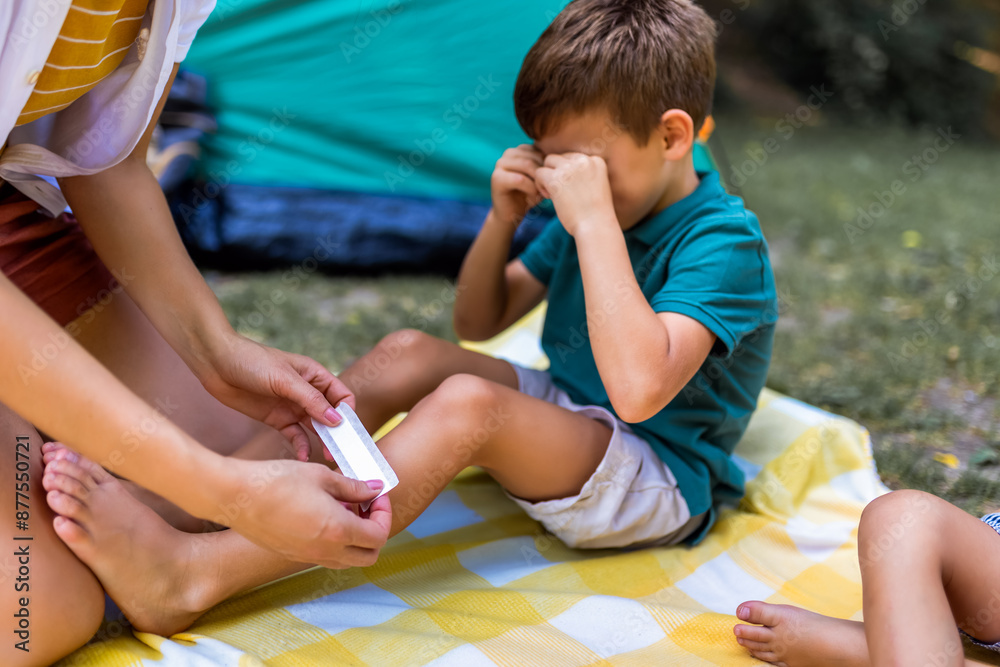 Mom putting a bandage on a little boy. Boy hurt himself on a camping.