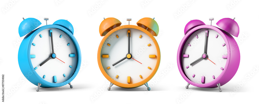 Three alarm clocks with different colors isolated from the white or transparent background, 3d render
